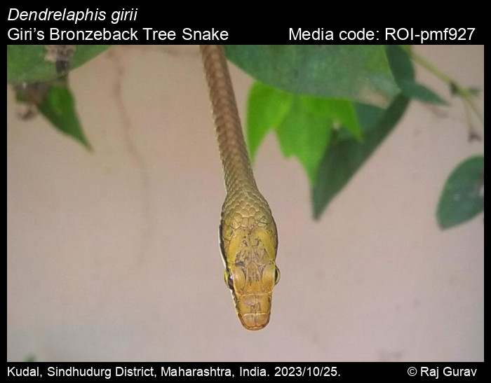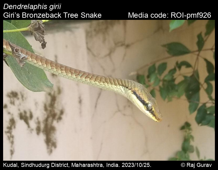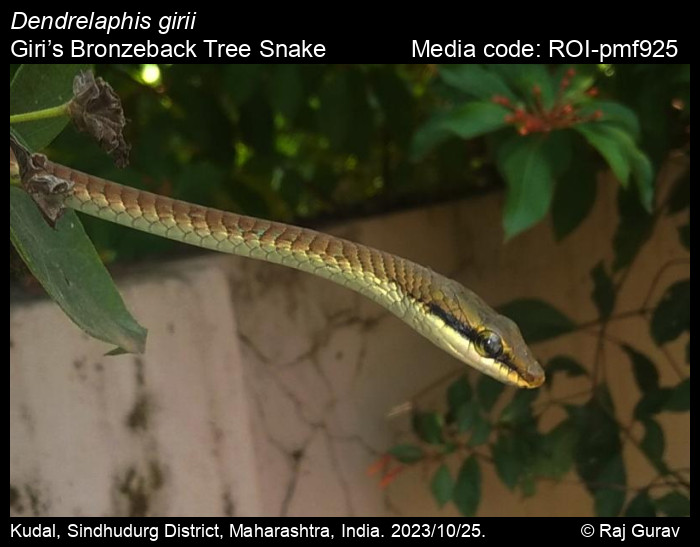 Anonymous 2025. Dendrelaphis girii Vogel & Van Rooijen, 2011 – Giri’s Bronzeback Tree Snake. In Kamdar, A. and K. Kunte. (Chief Editors). Butterflies of India, v. v.1.26. Published by the Indian Foundation for Butterflies. URL: https://www.indianreptiles.org/dendrelaphis-girii, accessed 2025/10/29.
