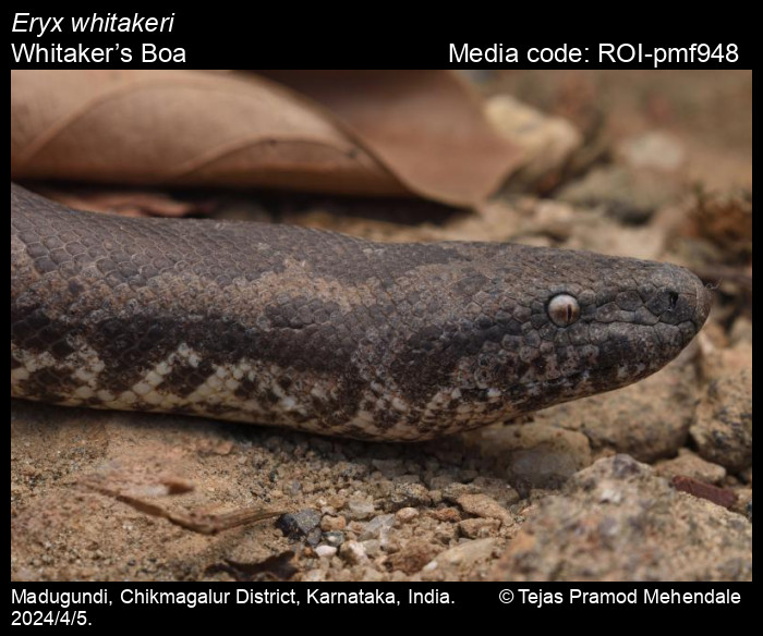 Anonymous 2025. Eryx whitakeri Das,1991 – Whitaker’s Boa. In Kamdar, A. and K. Kunte. (Chief Editors). Butterflies of India, v. v.1.26. Published by the Indian Foundation for Butterflies. URL: https://www.indianreptiles.org/eryx-whitakeri, accessed 2025/10/30.